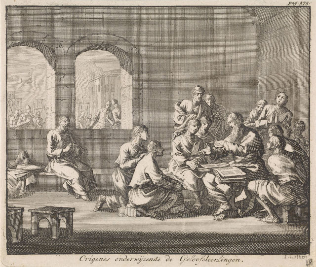 | Jan Luyken (1700) holland illusztrációja, amelyen Origenész tanítja tanítványait |